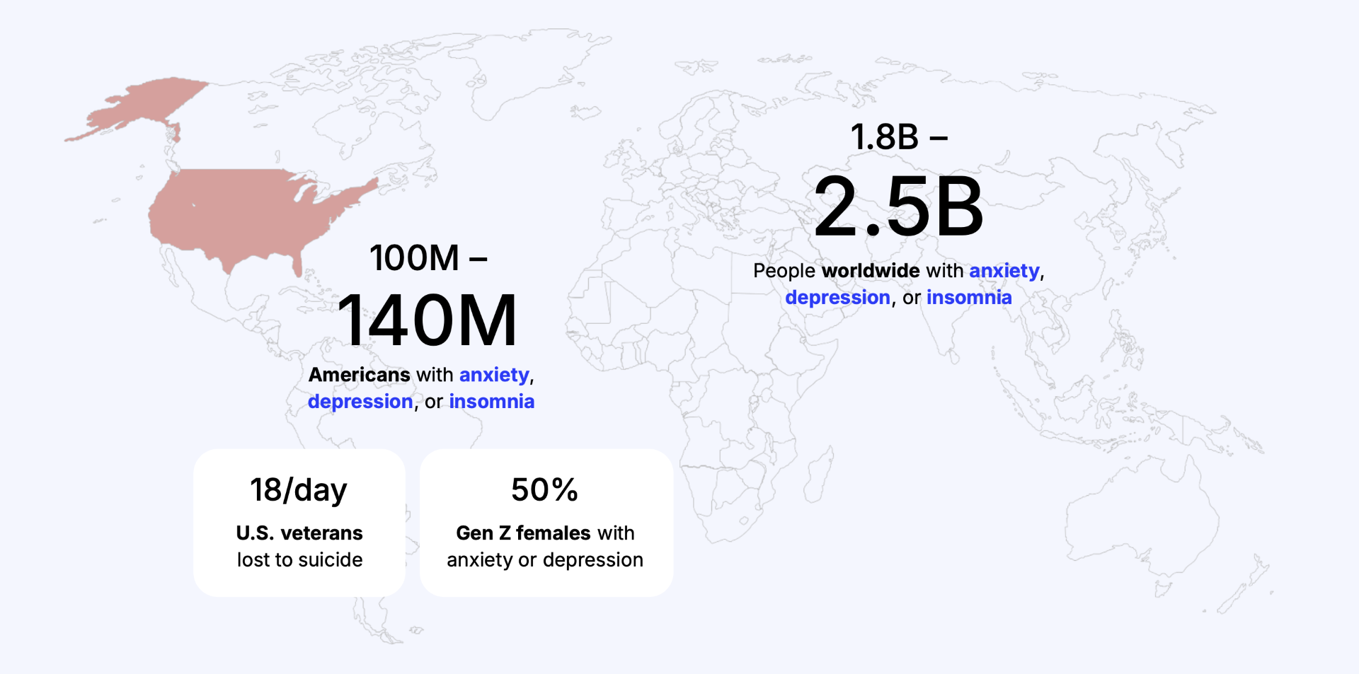 With as many as 45% of U.S. veterans and 40% of active-duty service members experiencing anxiety, depression, or insomnia—often co-morbid with PTSD—and with traditional treatments hamstrung by medication side effects, modest effectiveness, frequent dosage changes, multi-drug regimens, high relapse rates, and psychotherapy that is slow-acting, expensive, stigmatized, and constrained by nationwide shortages of qualified clinicians (including long wait times and poor access for rural veterans), both groups urgently need a rapid-acting, safe, self-administered, easy-to-use mental health solution that can be delivered at scale.